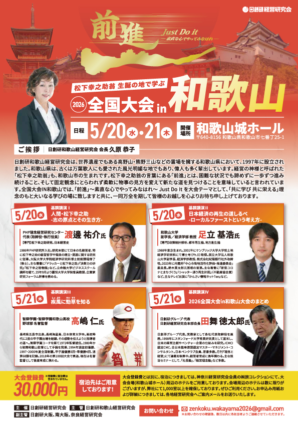 2026年全国大会in和歌山 公開日:2026年3月27日 Theme 『前進』 素直な心でやってみなはれ ~Just Do It~ 激動の経済情勢において、私たちは時に立ち止まり、悩みます。 しかし、道なき道を切り拓く方法はただ一つ。 失敗を恐れず、心を定めて「前進」することで […] 続きを読む